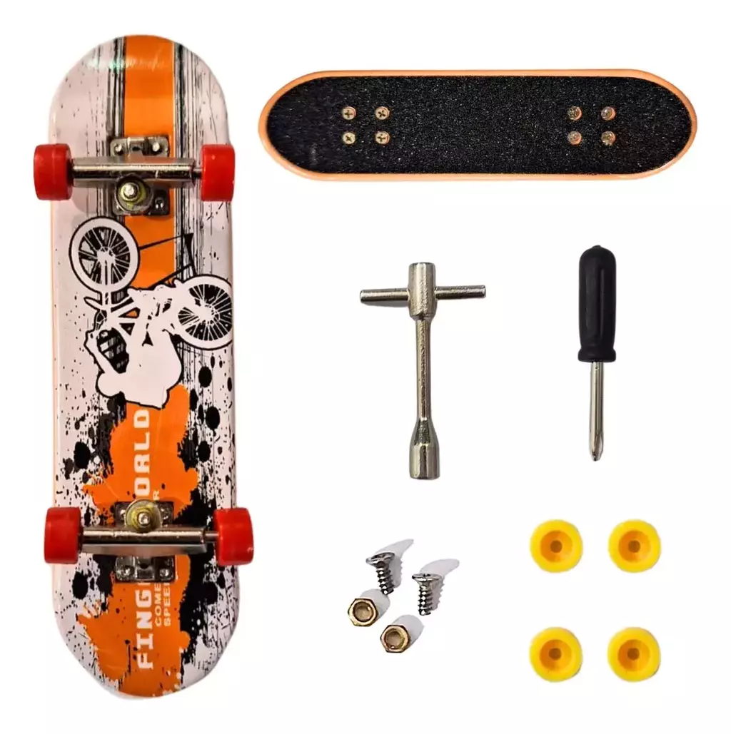 Descubra o Skate de Dedo, o kit perfeito para quem quer levar a emoção do finger skate para outro nível! Com rodas extras e chave especial, você tem tudo para personalizar e garantir manobras incríveis com muito estilo.